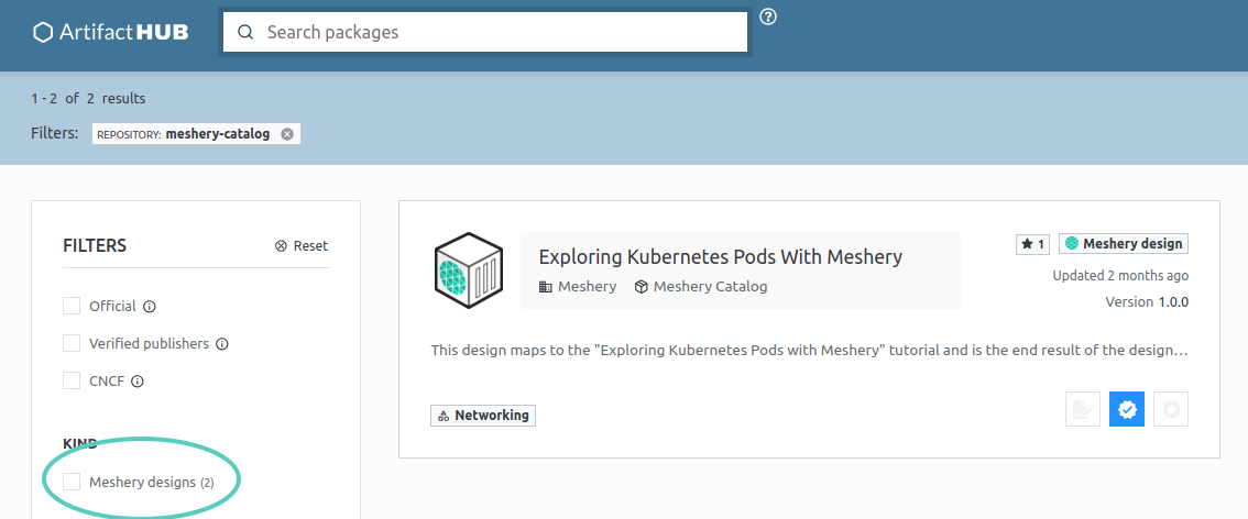 Thanks to this effort, all Designs published to the Meshery Catalog will automatically be available through the ArtifactHub Package Search. This means users can access a curated library of Designs to create, manage, and deploy cloud-native architectures with ease.